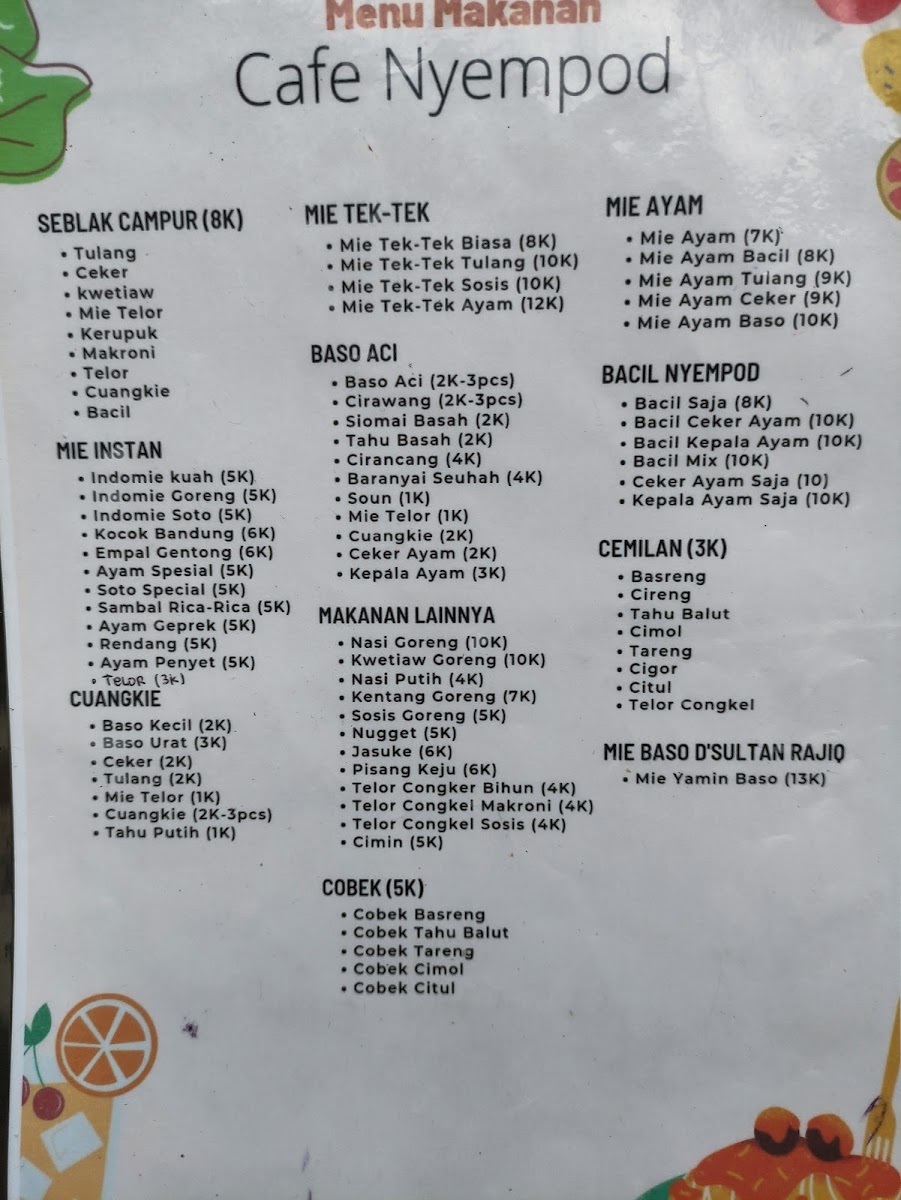 As you step into Cafe Nyempod, the inviting aroma of freshly prepared dishes greets you, promising a delightful culinary adventure. This cafe specializes in traditional Indonesian delicacies, with a standout menu option being their beloved baso aci. This delectable dish, renowned for its rich flavor and chewy texture, has quickly become a favorite among locals, as noted in the delightful review from customer Pupung Pundenswari, who praises it for its affordability and taste. Another satisfied patron, Shohibul Umam, echoes this sentiment, highlighting how the café's relaxed vibe makes it an ideal spot for socializing.